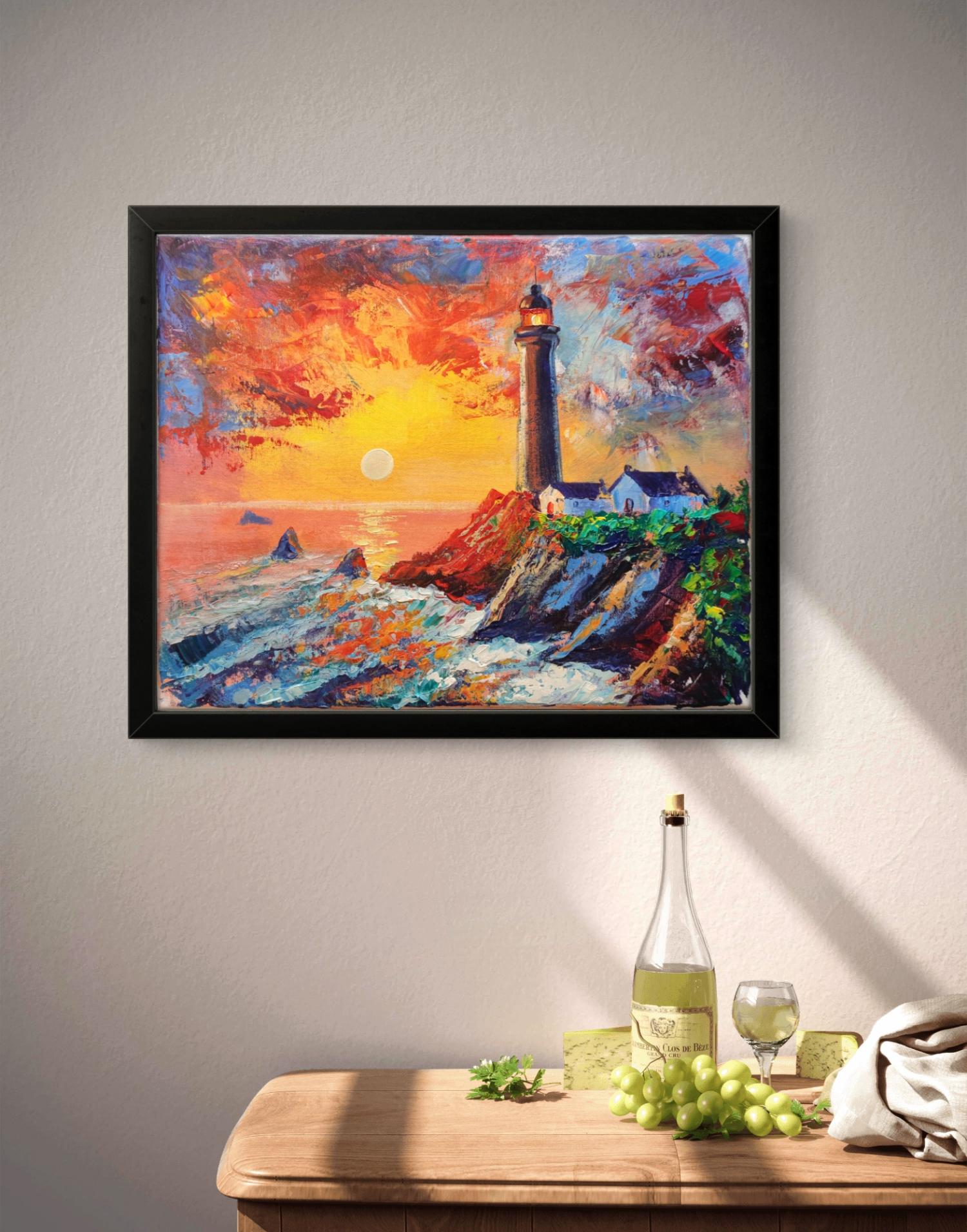 Ein Leuchtturm steht auf einem hohen Felsen. Darunter schlägt die Brandung gegen das Gestein. Der Himmel leuchtet in warmen Farben des Sonnenuntergangs, und auf dem Wasser tanzen helle Lichtreflexe.