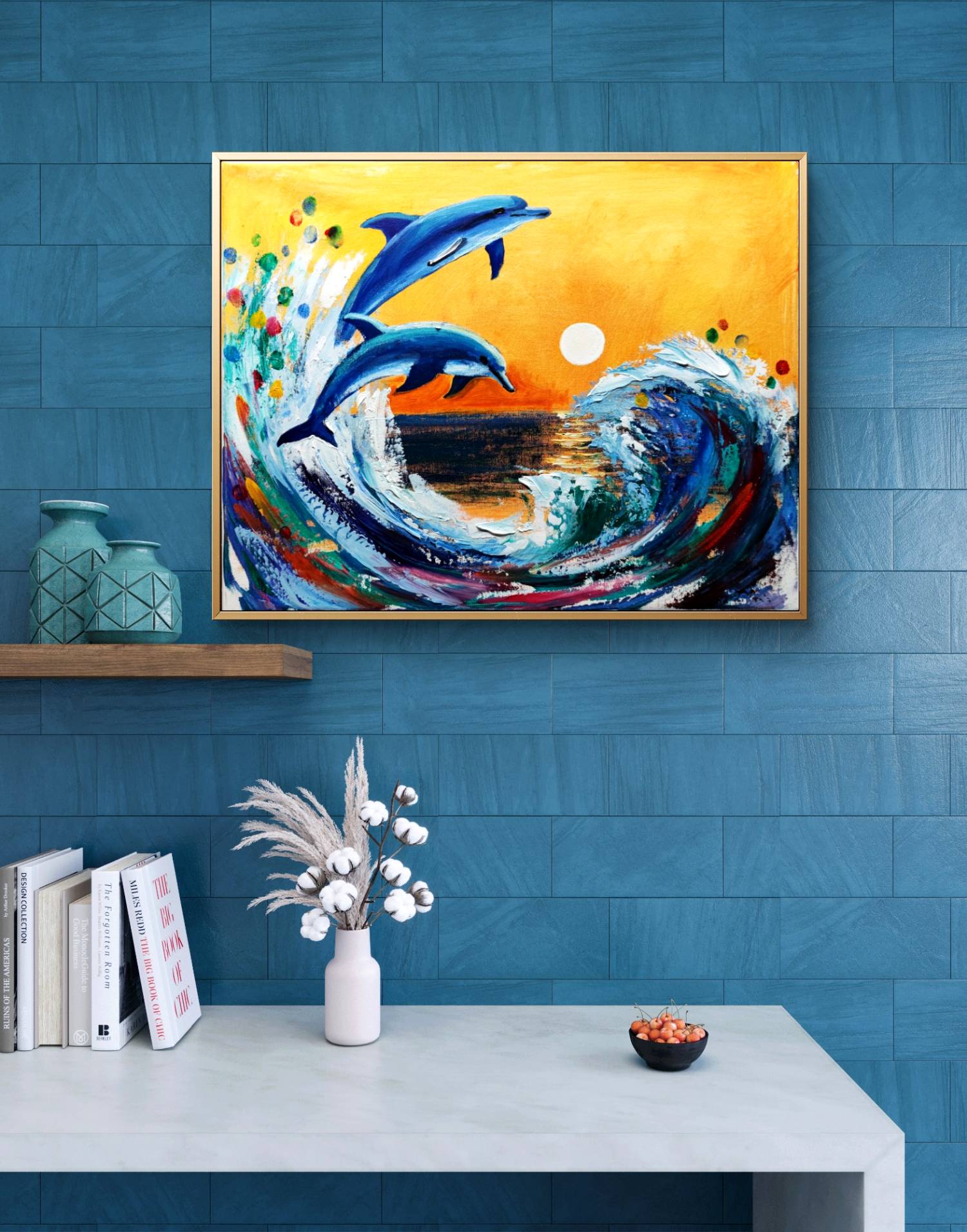 Elegante Delfine, die in der Abendsonne aus dem Wasser springen – begleitet von einer dynamischen Welle in leuchtenden Farben.