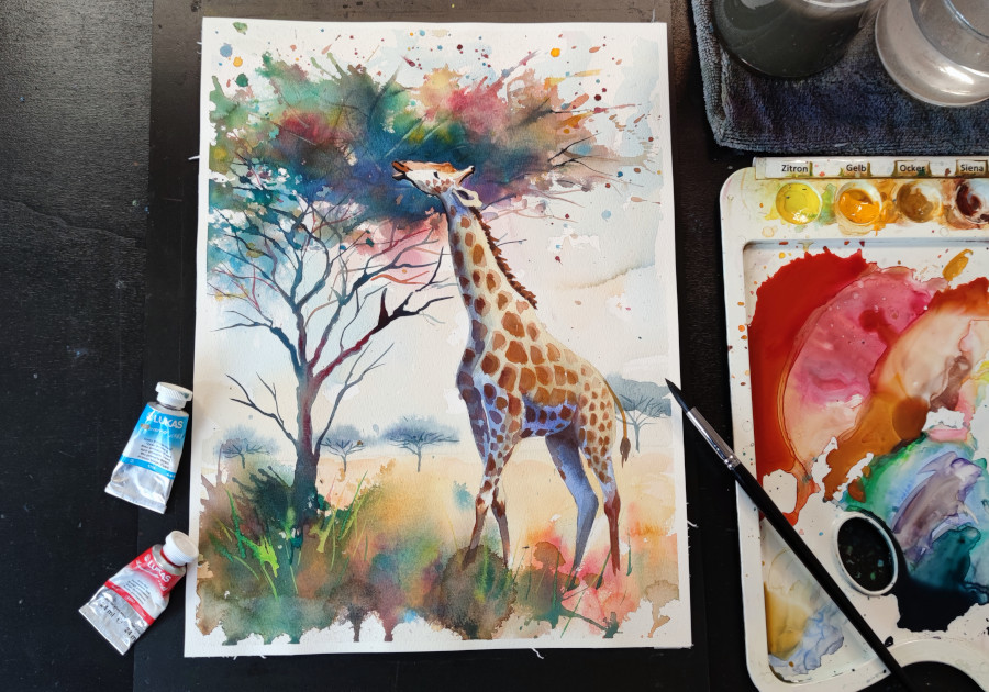 Wir werden die Anmut einer Giraffe einfangen, die sich an den Blättern eines Akazienbaums labt. Diese majestätischen Savannentiere bieten eine wunderbare Gelegenheit, mit lockeren und fließenden Techniken zu arbeiten.