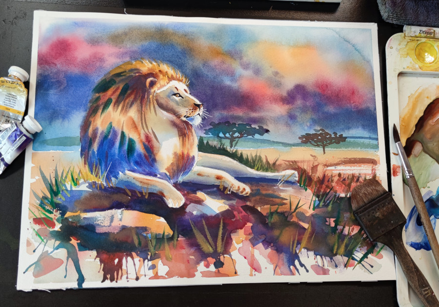 Lass uns gemeinsam diese beeindruckende Szenerie in Aquarell festhalten und die majestätische Präsenz des Löwen auf Papier bringen!