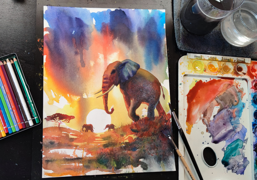 In unserem Aquarell-Tutorial gestalten wir eine beeindruckende Szene in der afrikanischen Savanne. Vor einem dramatisch fließenden Himmel und einer tief untergehenden Sonne am Horizont tritt ein majestätischer Elefant in den Vordergrund. Die warmen abendlichen Farben der Savanne und die geschickte Anwendung von Aquarellstiften und Salz verleihen diesem Motiv eine besondere Tiefe und Atmosphäre.