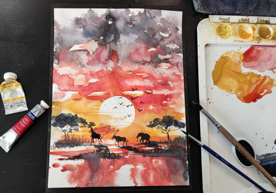 Hast du jemals den atemberaubenden Sonnenuntergang in der afrikanischen Savanne erlebt? In diesem Tutorial nehme ich dich mit auf eine Reise, um diese beeindruckende Szene in Aquarell festzuhalten. Mit einer Farbpalette aus Schwarz, Rot und Gelb schaffen wir eine dramatische Atmosphäre. Wir werden lockere und fließende Farbaufträge verwenden, um eine riesige Sonne am Horizont zu malen, während Silhouetten afrikanischer Tiere durch die Savanne ziehen. Lass uns gemeinsam die Magie dieses Augenblicks einfangen und auf Papier zum Leben erwecken.
