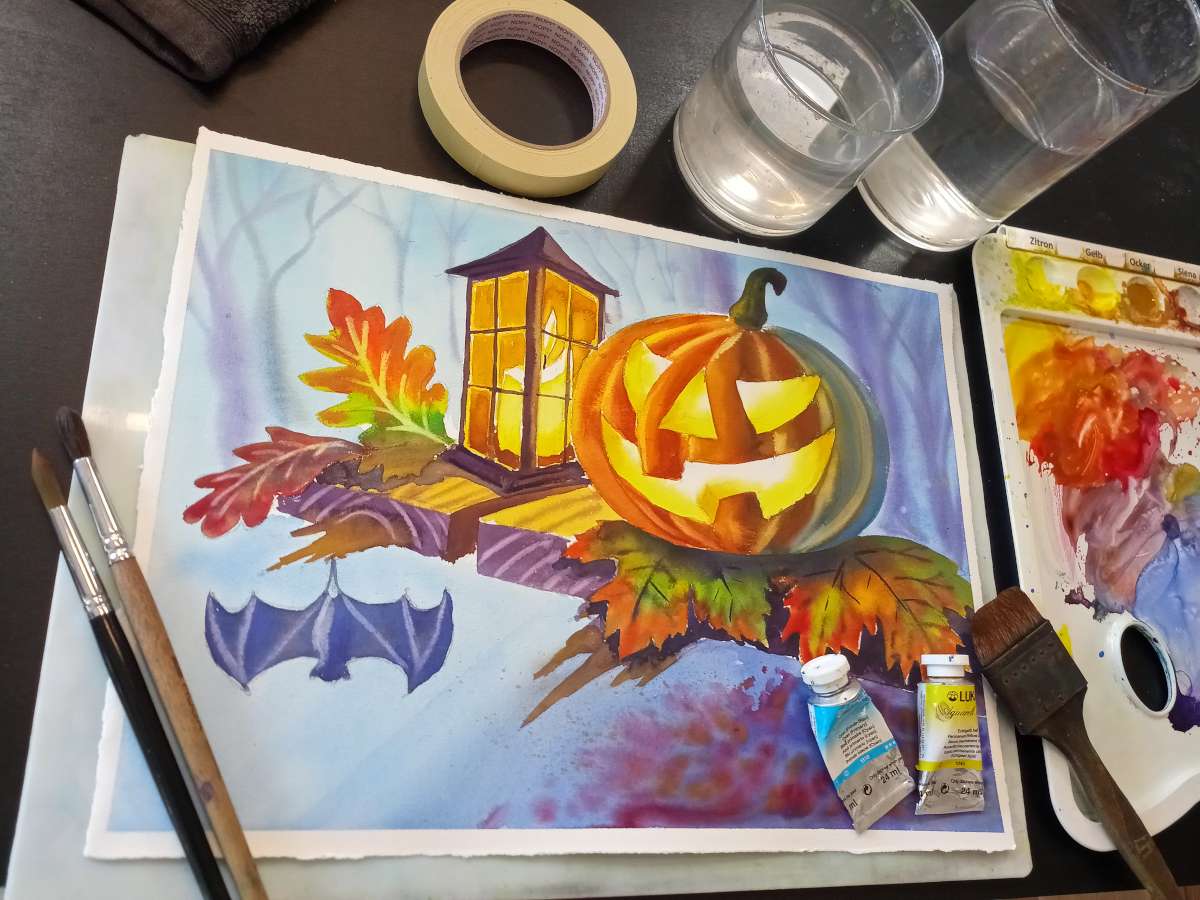 Entgehe dem Herbstblues mit einem kreativen Moment in Aquarell. In knapp 2 Stunden malen wir diese fantasievolle Szene mit einem Halloween-Kürbis, einer Laterne und einer Fledermaus. Lerne unterschiedliche Aquarell-Techniken anzuwenden: Nass-in-Nass, Nass-auf-Trocken, Spritztechnik etc.