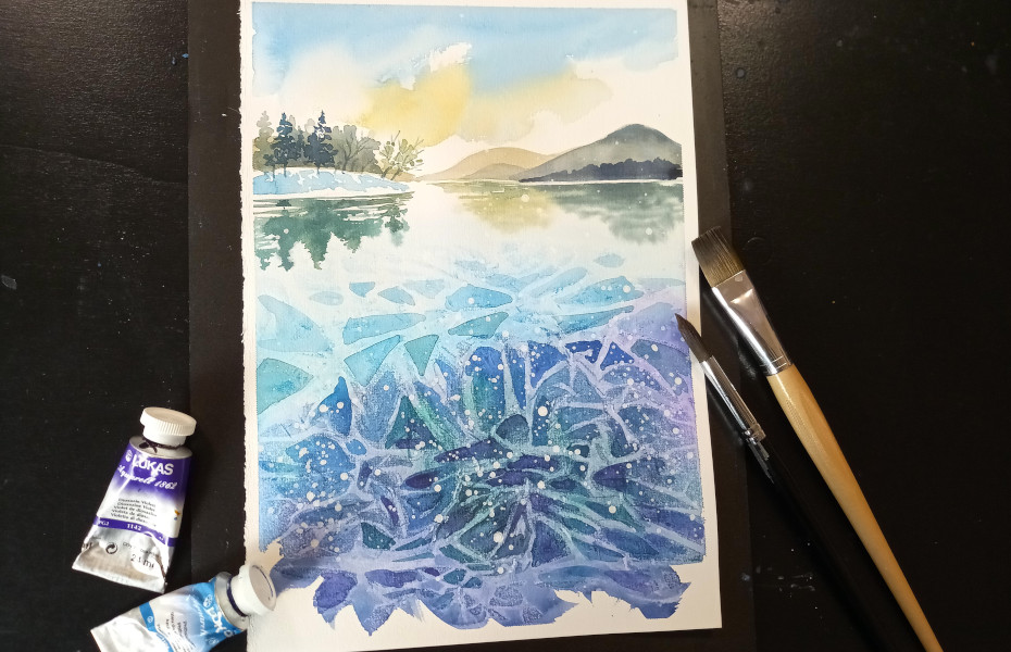 Entdecke die kreative Welt des Winters mit einem frostigen See-Motiv. Mit Frischhaltefolie gestalten wir einzigartige Eisstrukturen. Ein ideales Motiv, um Techniken zu erkunden und die eisige Schönheit einzufangen. Tauche ein in den Winterzauber!