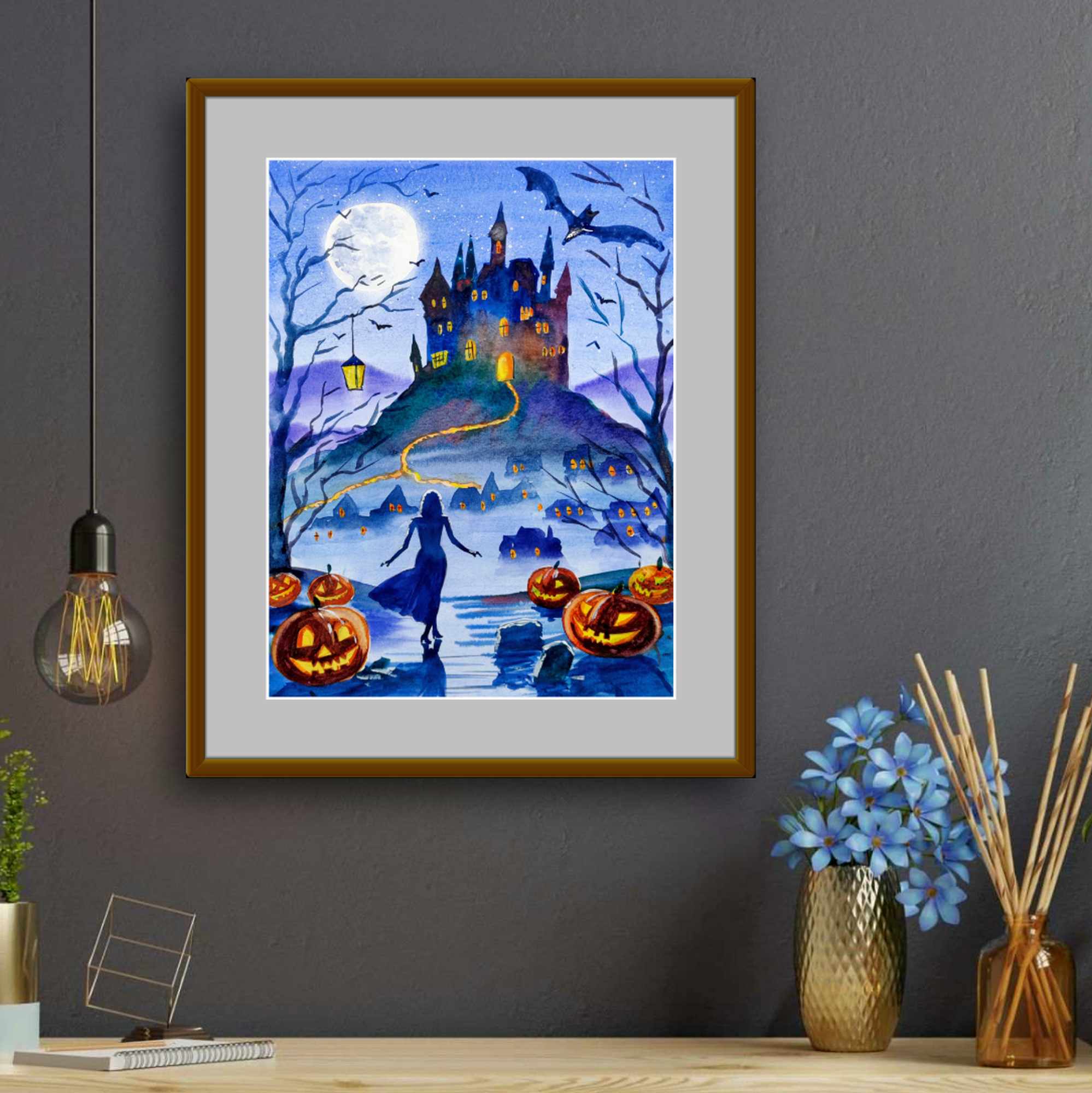 die geheimnisvolle Magie von Halloween in einer stimmungsvollen Aquarellszene zum Leben erwecken.
