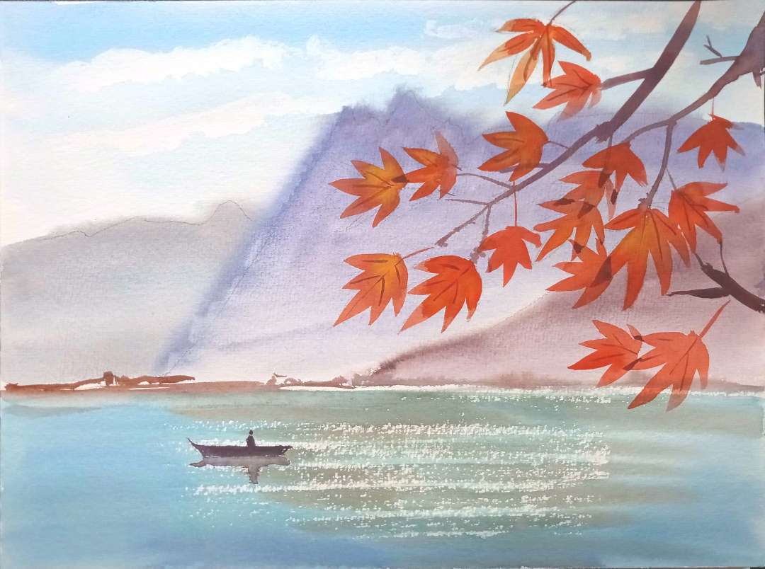 Ein einfaches Aquarell-Motiv für Anfänger mit einer Berglandschaft am Wasser mit farbenfrohen Herbstblättern. Gemalt wird mit drei Aquarell-Techniken: Nass-in-Nass, "trockener" Pinsel und Nass-auf-Trocken.