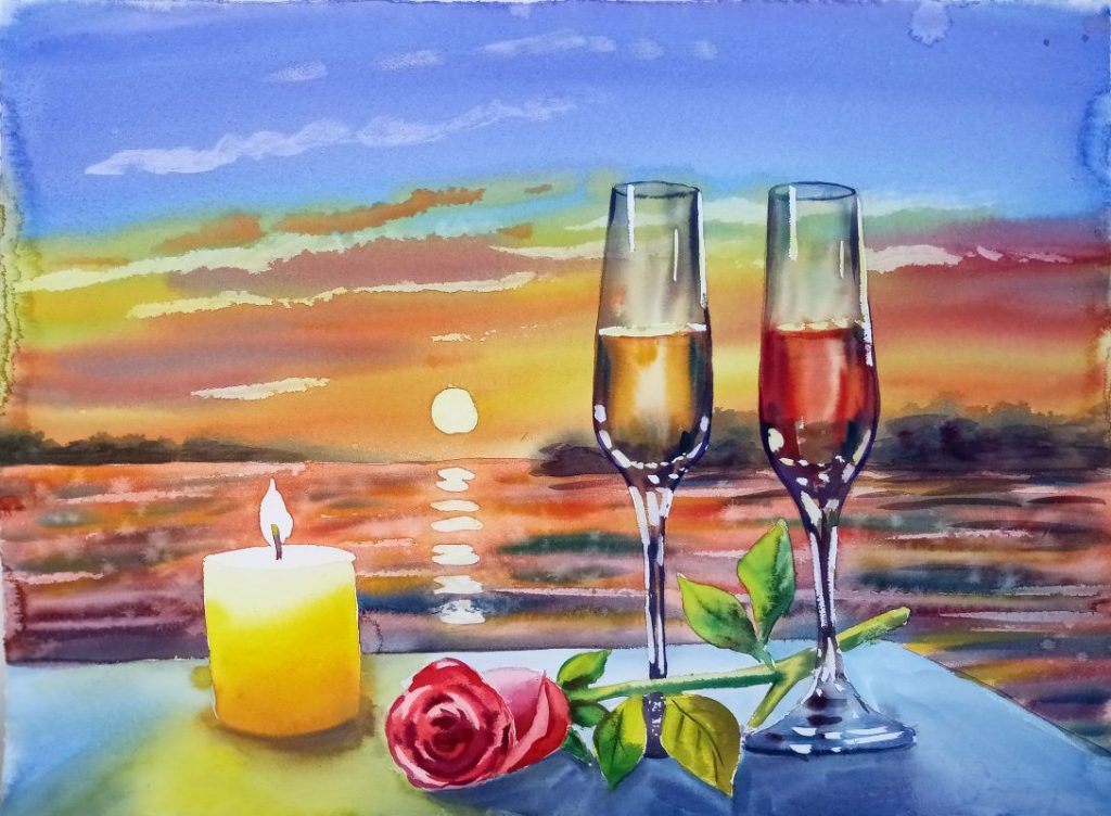 Sektgläser und eine Kerze mit einer Rose in Aquarell darstellen
