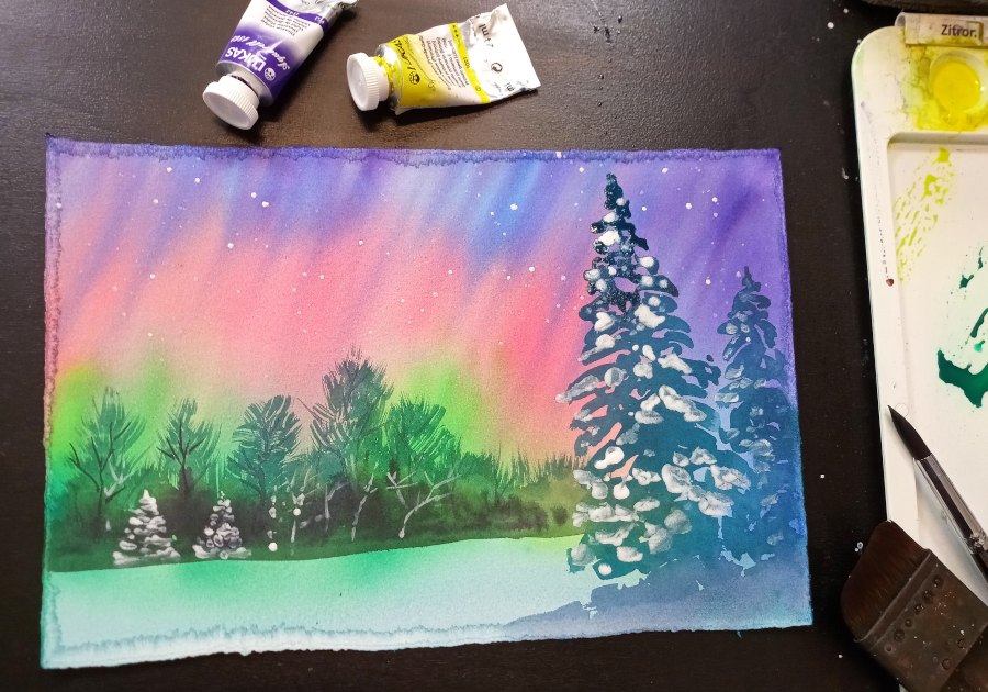 ART-ION Academy/Aquarell-Tutorial: Rosa-Grüne Polarlichter und Tannenbaum