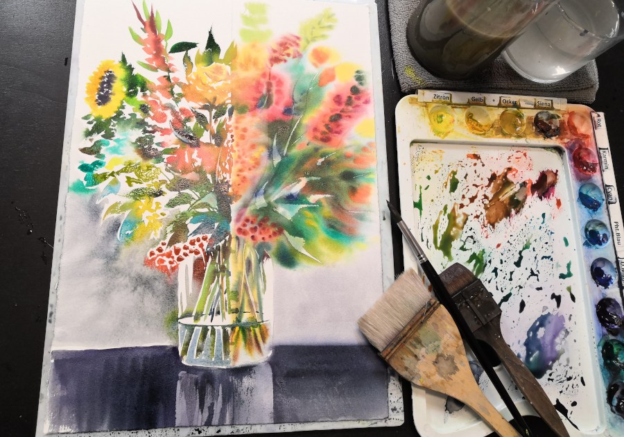 In diesem Motiv experimentieren wir mit zwei Techniken Nass-in-Nass und Nass-auf-Trocken und malen einen zweigeteilten bunten Feldblumen-Strauß, um die unterschiedliche Ausprägung beider Techniken zu spüren.